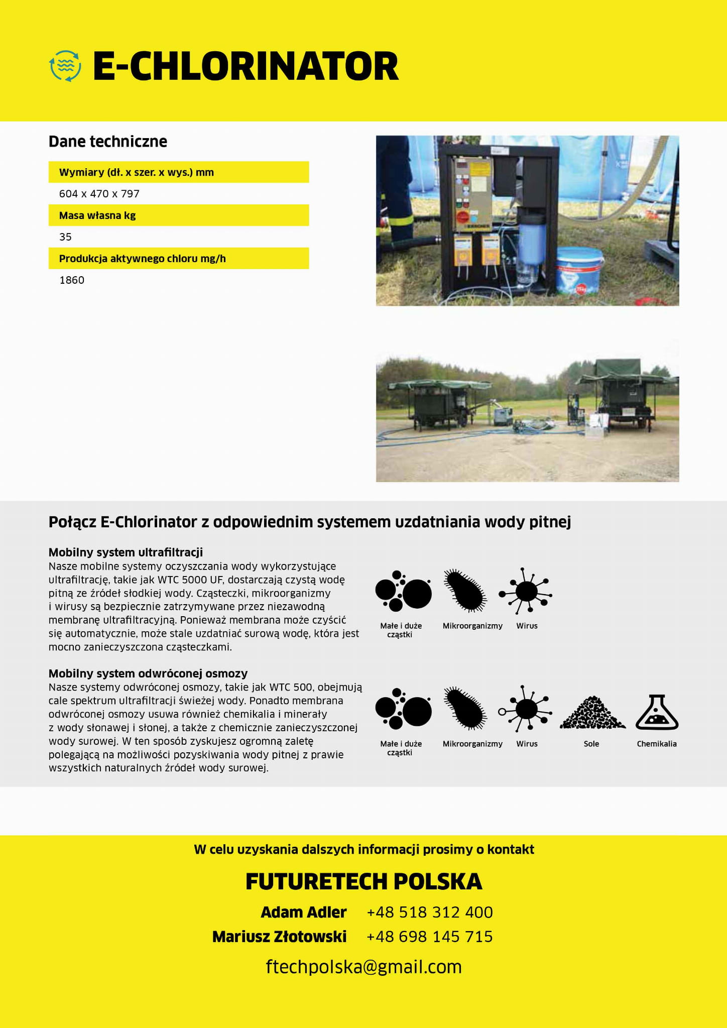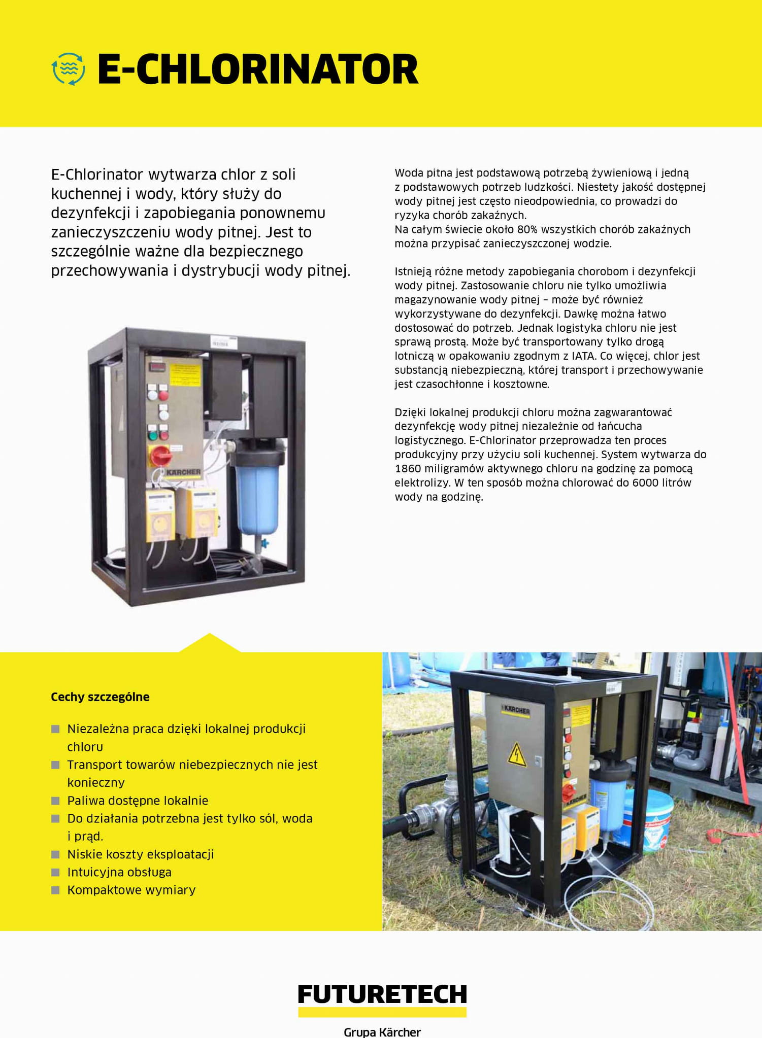 Urządzenie produkuje chlor do dezynfekcji wody pitnej z soli kuchennej. Dzięki temu do mobilnego