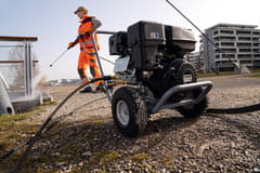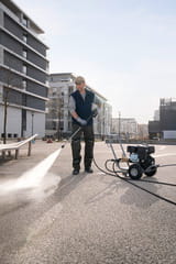 Urządzenie wysokociśnieniowe HD 9/25 G Classic bez podgrzewania wody, dzięki ciśnieniu roboczemu do 250 bar, wydajności tłoczenia 900 litrów wody na godzinę oraz wytrzymałej pompie korbowodowej sprosta nawet najbardziej wymagającym zadaniom w zakresie czyszczenia. Dzięki silnikowi benzynowemu EU STAGE V o dużej mocy, który eliminuje potrzebę korzystania z zewnętrznych źródeł zasilania, wyposażone w solidną stalową konstrukcję rurową i opony odporne na przebicie, urządzenie wysokociśnieniowe HD 9/25 G Classic doskonale sprawdzi się podczas trudnych zadań na budowach, w przemyśle, przestrzeniach komunalnych albo w firmach świadczących usługi budowlane. Ergonomiczny uchwyt oraz bardzo kompaktowe wymiary, jak również miejsce na akcesoria, np.: na wąż wysokociśnieniowy i lancę, ułatwiają obsługę i transportowanie urządzenia autem. Ważne części urządzenia są łatwo dostępne w przypadku konieczności wykonania przeglądu, a także skutecznie zabezpieczone przez zawory termostatyczne i bezpieczeństwa. Urządzenie nie posiada funkcji zasysania wody z alternatywnych źródeł.