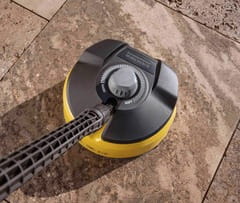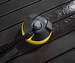 Obrotowe ramię z dwoma dyszami wysokociśnieniowymi w T-Racer T 5 pozwala usuwać zabrudzenia na dużych powierzchniach – czyszcząc szybko i wydajnie rozległe obszary zewnętrzne. Wyjątkowo praktyczne rozwiązanie: Przystawka do powierzchni może być regulowana, aby dysze znajdowały się w idealnej odległości od powierzchni, zależnie od rodzaju materiału. Znaczy to, że powierzchnie twarde takie jak kamień czy beton mogą być czyszczone tak samo wydajnie jak bardziej delikatne powierzchnie np. drewno. W rezultacie T-Racer T 5 czyści 2 razy szybciej niż lanca spryskująca. Co więcej, obudowa skutecznie chroni operatora i otoczenie przed rozpryskami wody, a strumienie wody podnoszące przystawkę w górę sprawiają, że manewrowanie jest łatwiejsze niż kiedykolwiek. Nawet powierzchnie pionowe, takie jak brama garażowa mogą być skutecznie czyszczone dzięki ergonomicznym uchwytom. Przeznaczony do urządzeń wysokociśnieniowych klas K 2 do K 7.