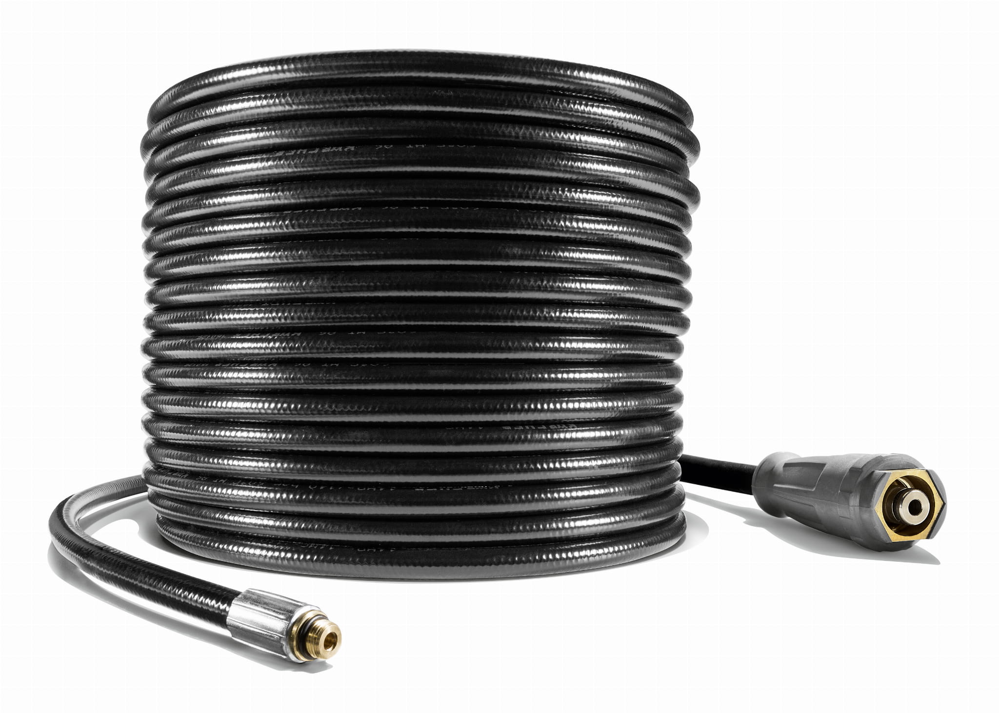 30 m wąż do czyszczenia rynien, rur i kanalizacji zakończony dyszą z jednym strugiem prostym i trzema wstecznymi. Wąż jest kompatybilny z akcesoriami zakończonymi gwintem M-22